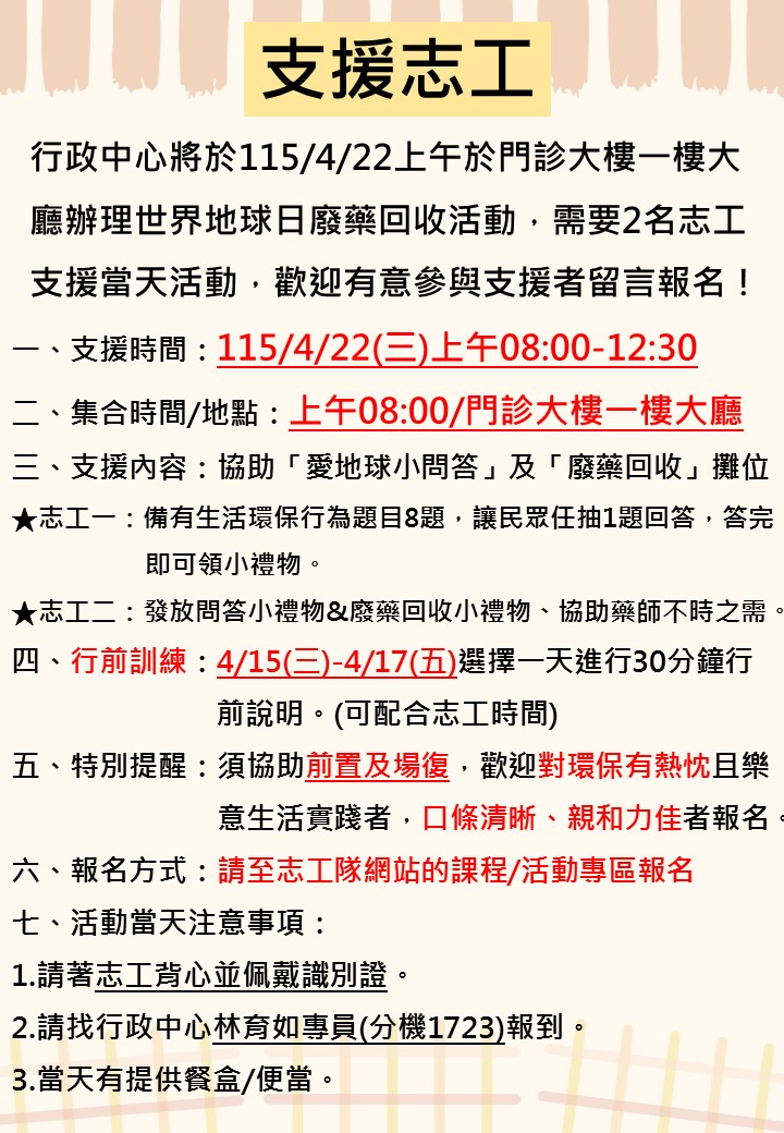 行政中心將於115/4/22上午於門診大樓一樓大廳辦理世界地球日廢藥回收活動,需要2名志工支援當天活動,歡迎有意參與支援者留言報名!